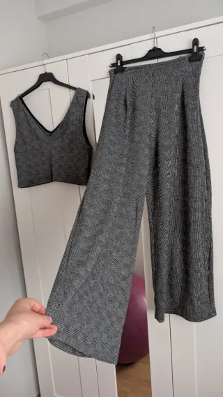 Conjunto de dos piezas con estampado de cuadros. - Top con escote en V. - Pantalón ancho de pierna.