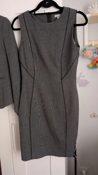 Conjunto de vestir gris compuesto por chaqueta, falda y vestido. - Chaqueta de corte clásico. - Falda y vestido a juego. - Diseño elegante.