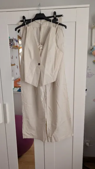 Conjunto de dos piezas en color beige, ideal para un look elegante y moderno. - Pantalón de corte ancho. - Chaleco con escote en V y un botón.
