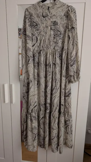 Vestido largo con un estampado abstracto en tonos beige y negro. Tiene mangas largas y un corte fluido. - Estampado abstracto. - Mangas largas. - Corte largo y fluido.