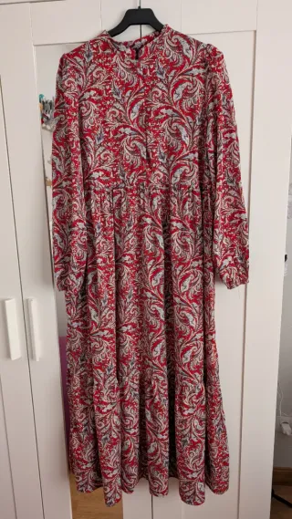 Vestido largo con un bonito estampado floral en tonos rojos y blancos. Tiene mangas largas y un corte fluido. - Estampado paisley. - Cuello alto. - Mangas largas abullonadas. - Largo midi.