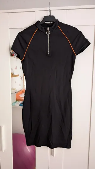 Vestido negro de manga corta con cuello alto y detalle de cremallera frontal. - Ribete de color naranja en cuello, mangas y costados. - Cremallera plateada con tirador. - Diseño ajustado.