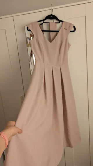 Vestido elegante de color rosa palo, con un diseño de vuelo en la falda. Nuevo con etiqueta. - Escote en V. - Mangas cortas. - Falda con pliegues.