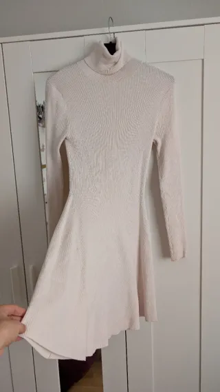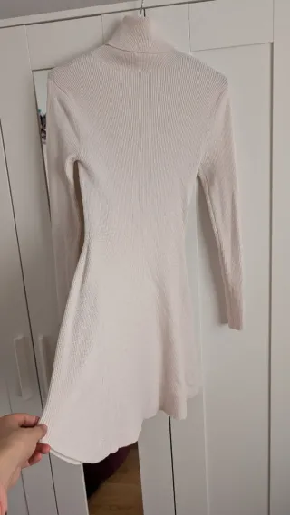 Vestido de punto con cuello alto y manga larga. Su diseño acampanado le da un toque moderno. - Tejido de canalé. - Color blanco-rosita cálido