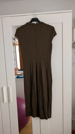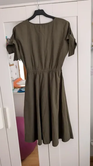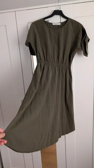 Vestido de manga corta en color verde militar. Tiene goma en la cintura para un mejor ajuste. - Manga corta. - Cuello redondo. - Goma en cintura.