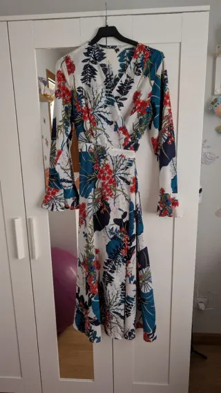Vestido largo con estampado tropical y cinturón. - Escote en V. - Mangas largas acampanadas. - Cinturón para ajustar a la cintura. - Estampado de hojas y flores rojas.