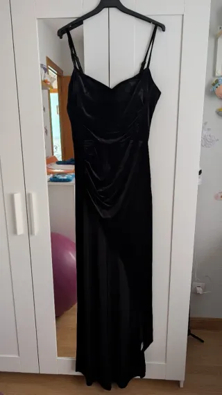 Elegante vestido largo negro, ideal para eventos especiales. Su diseño presenta un escote drapeado y una abertura lateral. - Material: Terciopelo. - Tirantes finos ajustables. - Largo hasta el suelo.
