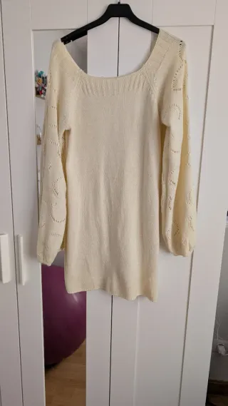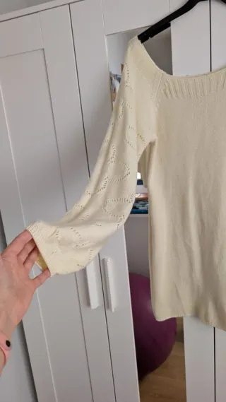 Jersey de punto fino en color beige, ideal para añadir un toque de elegancia a tu armario. - Manga larga. - Diseño con escote cuadrado. - Detalles calados en las mangas.