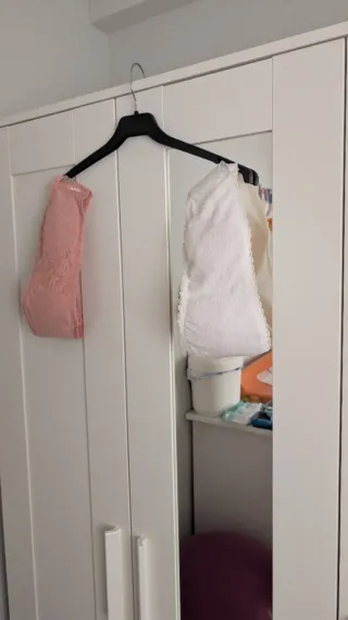 Conjunto de lencería de encaje en color rosa y blanco. - Sujetador rosa con detalles de encaje. - Braguita blanca con ribete de encaje.