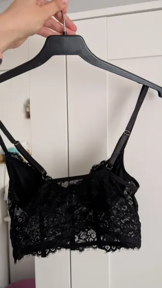 Top tipo bralette de encaje negro. - Diseño de encaje floral. - Tirantes ajustables. - Cierre de corchetes.