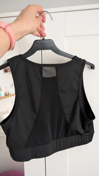 Top deportivo de color negro, ideal para actividades físicas. - Diseño sin mangas. - Banda elástica en la parte inferior. - Detalle de malla en la espalda.
