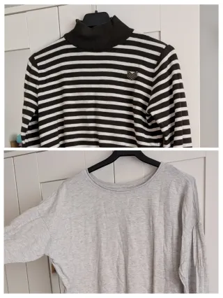 Conjunto de dos prendas de ropa. - Jersey de rayas blancas y negras con cuello alto y detalle en el pecho. - Camiseta gris de manga larga con cuello redondo.
