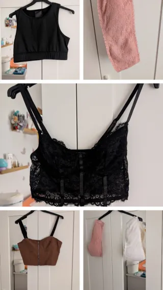 Conjunto de cinco sujetadores de diferentes estilos. - Sujetador deportivo negro. - Sujetador lencero negro de encaje. - Sujetador marrón con cremallera frontal. - Sujetadores rosa y blanco de encaje.