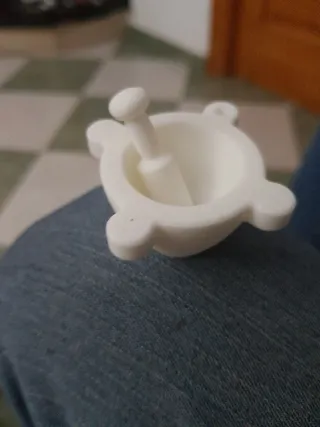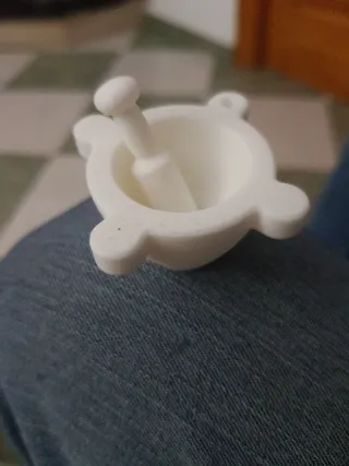 Pequeño mortero de plástico blanco, ideal para moler especias o hierbas. - Material: Plástico. - Color: Blanco. - Diseño con asas laterales.