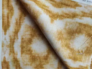 Tela con un diseño abstracto en hilo dorado sobre fondo color leche. La textura presenta un tejido acanalado que le da un acabado elegante. Retal de tela fina, blanda, sintética. - Diseño: Líneas doradas entrelazadas. - Medida: 1.40x1.80 El precio es por el retal entero. Hago lotes para hacerte ahorrar en los gastos de envío. Puede elegir lo que gusta y enviaré en un paquete.