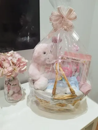 Preciosa cesta de regalo para bebé en tonos rosas. Contiene varios artículos esenciales para el cuidado del recién nacido. - Peluche suave. - Biberón. - Set de cuidado para bebé. - Toallitas perfumadas. - Calcetines. Más en mi perfil.