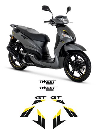 Set de pegatinas decorativas para Peugeot Tweet GT. - Diseño GT con detalles en amarillo y negro. - Incluye varias pegatinas para personalizar tu moto.