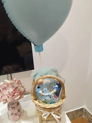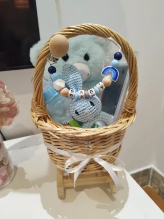 Preciosa cesta de regalo para bebé con temática azul. - Cesta de mimbre con forma de cochecito. - Peluche de oso azul. - Sonajero de conejo tejido. - Cadena para chupete con cuentas y arcoíris. - Biberón azul. - Kit de huellas 👣. Más en mi perfil.