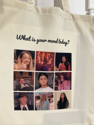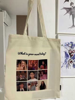 Bolsa de tela con un diseño original que incluye una pregunta y una cuadrícula de imágenes. - Frase: What is your mood today? - Diseño con 9 imágenes. - Material: Tela.