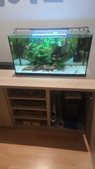 Se vende pecera de 100l, de la marca ika con todo lo necesario para su funcionamiento. - Incluye filtro. - Iluminación LED. - Termómetro. - Plantas naturales. - madera