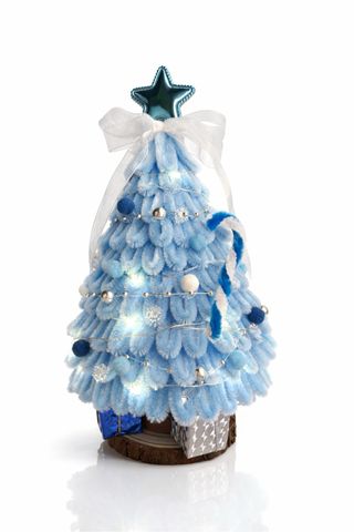 arbolito de Navidad hecho a mano con limpiapipas de color azul. Perfecto para decorar en las fiestas. - Decorado con luces LED cálidas. - Incluye adornos como bolitas plateadas y blancas, y copos de nieve. - Rematado con una estrella azul brillante y un lazo blanco. - Base de madera con pequeños regalos envueltos
