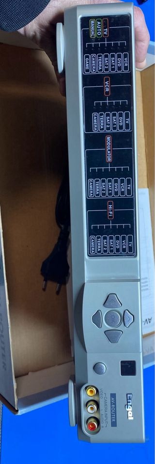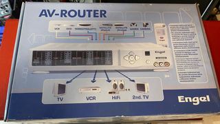 Distribuidor de audio y video Engel AV-ROUTER. Permite dirigir varias señales audiovisuales a diferentes destinos simultáneamente. No es un doblador normal, todas las entradas se conmutan mediante un circuito electrónico, asi que la conmutación es perfecta. Incluye mando a distáncia - Conexiones para VCR, DVD, Satélite (Digital/Analógico), TDT, Juegos y Cámara. - Salidas para TV, VCR, HiFi y 2ª TV. - Incluye mando a distancia.