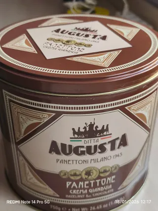 Elegante lata de latón de la marca Augusta, con diseño inspirado en Panettone Milano 1945. - Lata de latón con motivos decorativos. - Diseño de la marca Augusta. - Inspiración Panettone Milano 1945.