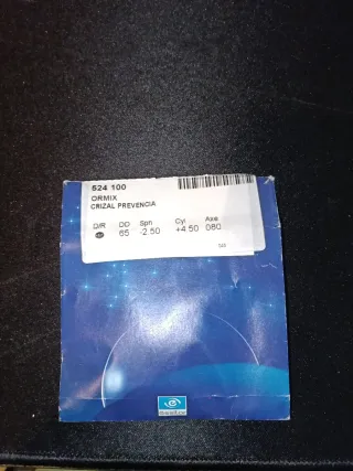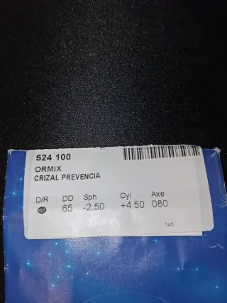 Cristales para gafas Ormix Crizal Prevencia. - Modelo: 524 100 - Diámetro: 65 mm - Esfera (Sph): -2.50 - Cilindro (Cyl): +4.50 - Eje (Axe): 080