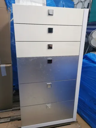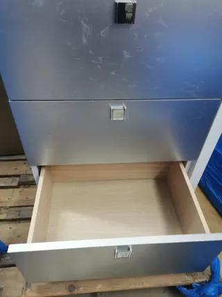 Conjunto de cómoda y dos mesitas de noche a juego. Diseño moderno con acabados en blanco y plateado. - Cómoda de seis cajones. - Dos mesitas de noche con un cajón cada una. - Tiradores cuadrados metálicos. ( precio negociable)