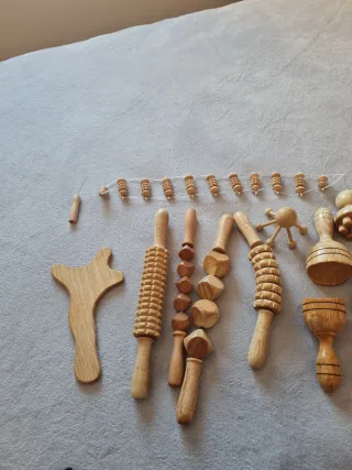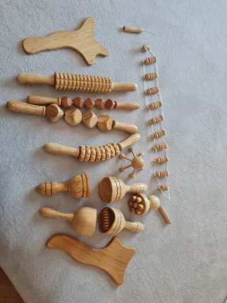 Conjunto de herramientas de madera para maderoterapia. 100%colombiano - Rodillo de masaje con estrías. - Rodillo de masaje con cubos. - Rodillo de masaje con bolas. - Copa de masaje. - Tabla de masaje. - Herramienta de masaje con 5 bolas. - Herramienta de masaje con 3 bolas.