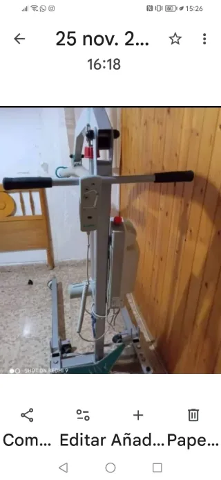 Grúa de ayuda para personas mayores o con movilidad reducida. Es un dispositivo de asistencia para facilitar el movimiento. - Estructura metálica. - Incluye arnés. - Ruedas para desplazamiento.