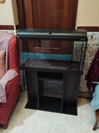 Acuario de 100 litros con su mesa a juego. Ideal para crear tu propio ecosistema. Tiene muy poco uso y super cuidada, no tiene nada de sarro ni un solo arañazo - Capacidad de 100 litros. - Incluye mesa. - Diseño moderno.
