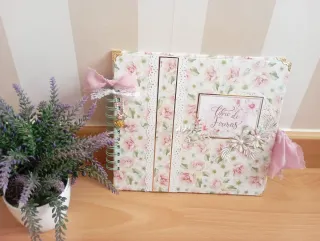 Precioso álbum de firmas decorado con un delicado estampado floral de rosas en tonos pastel. Ideal para guardar los recuerdos de un día especial. Hecho a mano - Diseño con encaje y lazo rosa. - Detalle de flor y hoja en relieve. - Inscripción Libro de Firmas en la portada.