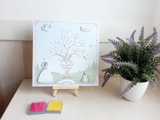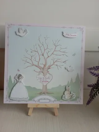 Un bonito árbol de huellas para celebrar una comunión. Incluye un diseño con un vestido de comunión, un conejito y palomas. Medidas: 20x20 Viene con tintas y soporte para sujetarlo - Marco para comunión. - Diseño de árbol con detalles. - Incluye elementos decorativos.