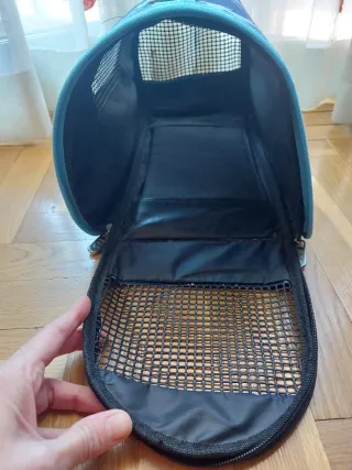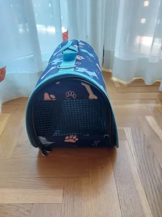 Transportín para gatos o animales pequeños. Ideal para viajes o visitas al veterinario. - Fabricado en tela resistente. - Malla transpirable en los laterales y la parte superior. - Cierre con cremallera. - Asa para facilitar el transporte. Medidas: 35cm largo 19cm alto y 20cm ancho