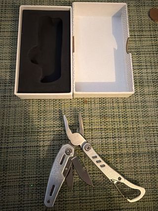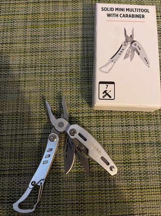 Herramienta multiusos compacta con mosquetón integrado. Ideal para llevar contigo a todas partes. - Diseño plegable. - Incluye pinzas, navaja y otras herramientas.