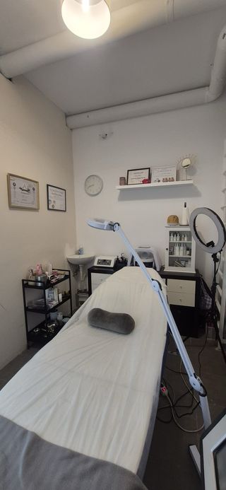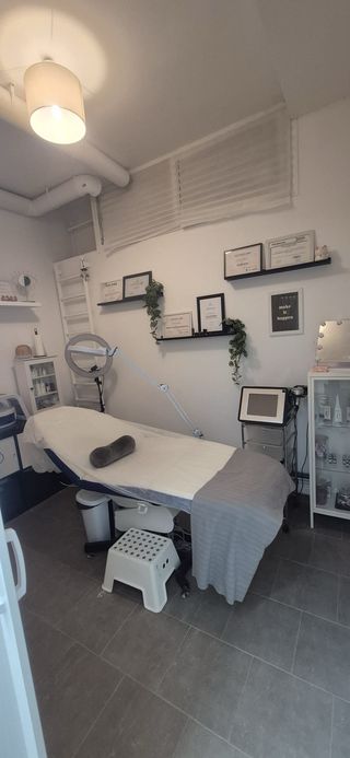 Espacio de trabajo equipado para profesionales de la estética en Alcorcón. Ideal para tratamientos corporales. - Cama de tratamiento. - Lavabo. - Mueble de almacenaje.