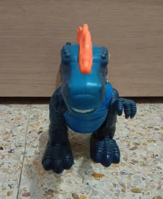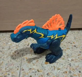 Figura de dinosaurio Espinosaurio con detalles llamativos. - Color principal azul con detalles en naranja y amarillo. - Diseño con aleta dorsal característica. - Con ruedas en las patas. - No funcionan las pilas.