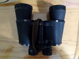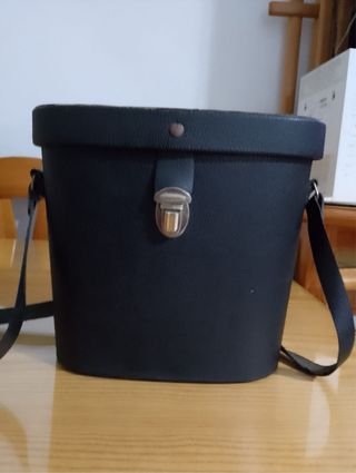 Estuche de cuero sintético negro con prismaticos en buen estado - Material: cuero sintético. - Color: negro. - Cierre: hebilla metálica.