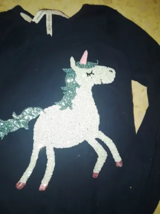 Vestido azul marino con un divertido diseño de unicornio. - Unicornio con lentejuelas plateadas y detalles en verde y rosa. - Manga larga. - Talla 7-8 años.