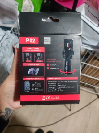 Estabilizador P02 para móvil con seguimiento facial automático. - Rotación horizontal de 360°. - Material principal: ABS. - Color: Negro, Blanco. - Tamaño del producto: 275x95x95mm (con base). - Peso del producto: 270g. - Soporte para móvil: 65-95mm.