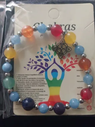 2u. Pulsera de piedras naturales con los colores de los chakras y un amuleto celta. - Piedras de colores que representan los 7 chakras. - Amuleto celta decorativo. - Cuentas plateadas. - Incluye información sobre los chakras.
