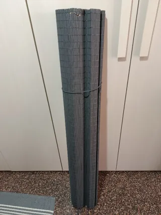 Estera enrollable de bambú en color oscuro RECORTABLE Ideal para exteriores o decoración. Está sin usar Medida ancho de 1,20 metros Baja hasta 1,60 metros - Material: Bambú. - Color: Oscuro. - Diseño enrollable para fácil almacenamiento. Precio original 11€