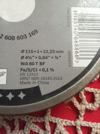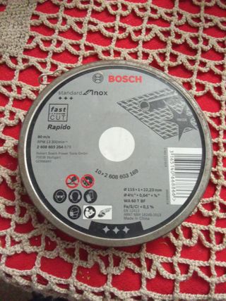 Disco de devastar Bosch Inox para piedra. Está prácticamente nuevo. - Diámetro: 115 x 1 x 22,23 mm (4 1/2" x 0,04" x 7/8") - WA 60 T BF - Fe/S/CI < 0,1 % - RPM: 13.300 min⁻¹ - Fabricado en China