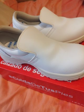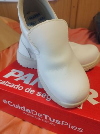 Vendo un par de zapatos de seguridad Panter, talla 40, blancos y de estilo slip-on. Son ideales para el trabajo. Están nuevos. - Diseño slip-on para una puesta fácil. - Color blanco. - Punta reforzada para mayor protección. - Suela resistente e antideslizante.