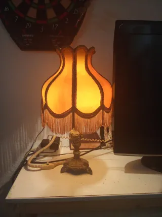 Precioso par de lámparas de mesita de noche antiguas, con estructura de latón. Ideales para dar un toque vintage a tu hogar. - Dos lámparas de estilo clásico. - Base de latón con detalles decorativos. - Pantalla de tela con flecos. Una 50€ y la pareja 80€ , algo negociable
