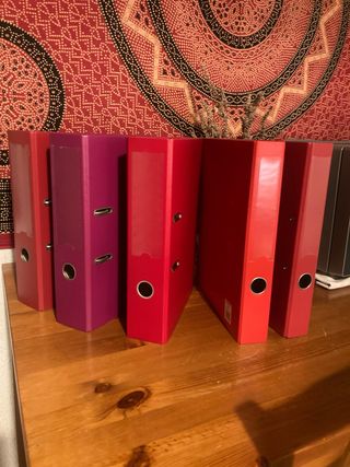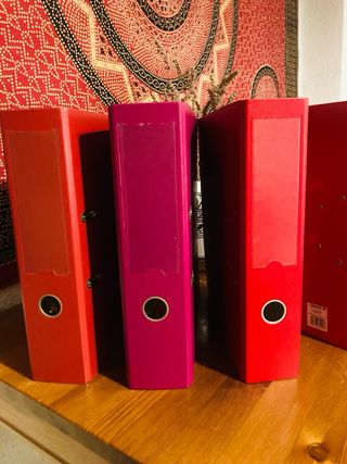 Lote de carpetas archivadoras A4 Vendo conjunto de 5 carpetas (3 gruesas y 2 medianas) de anillas grandes en muy buen estado (apenas usadas). Colores vivos: rojo, granate y morado. Ideales para oficina, estudios o tener los papeles bien organizados en casa. Cierre metálico y lomo ancho con hueco para sacar fácilmente. • Tamaño: A4 estándar • Lomo ancho (7,5 cm aprox.)