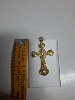 Elegante colgante con forma de cruz con acabado dorado y adornado con circonitas brillantes. Un accesorio llamativo y lleno de detalles. - Diseño de cruz con ornamentos. - Incrustaciones de circonitas. - Acabado dorado.