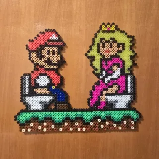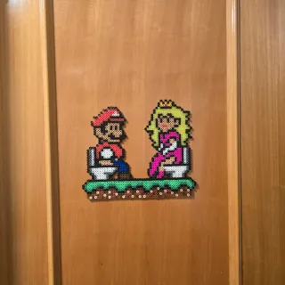Figura decorativa de Mario Bros y Princesa Peach sentados en el inodoro, hecha con cuentas Perler. - Diseño inspirado en el videojuego. - Ideal para poner en puerta de baño.. - Hecho a mano con detalle.
