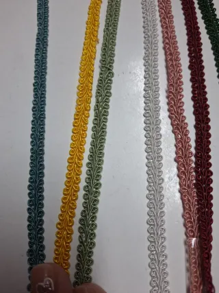 Cinta de pasamanería con un diseño trenzado y festoneado. Ideal para adornar y dar un toque especial a prendas de ropa, cortinas o manualidades. - Disponible en varios colores: azul verdoso, amarillo, verde, blanco, rosa palo, burdeos, plateado y verde oscuro. - Material textil. Preguntar x la disponibilidad. Se vende 4m× 1€